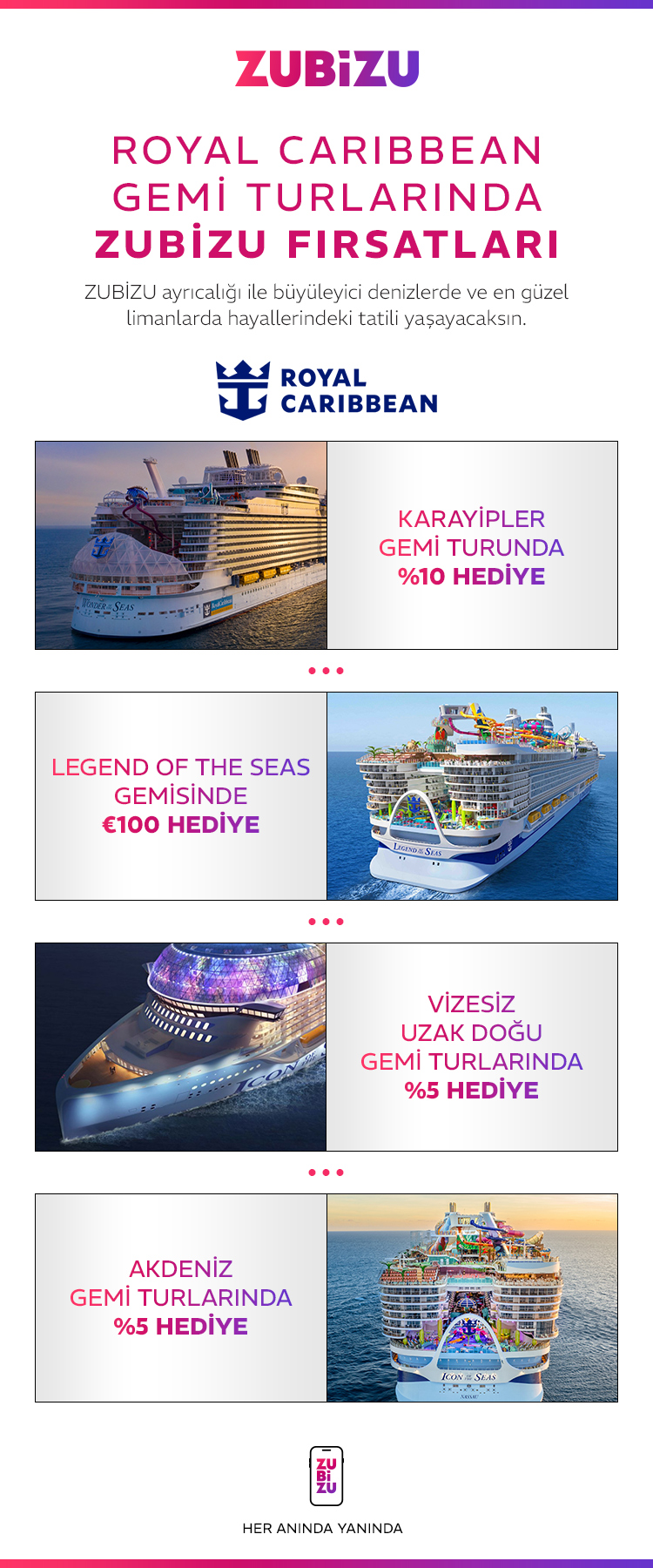 Zubizu, Türkiye’nin önde gelen ayrıcalık ve indirim platformu olarak Royal Caribbean ile özel iş birliği yapıyor. “ZUBiZU ayrıcalığı ile büyüyüleyici denizlerde” sloganıyla sunulan kampanyalar, Türk yolculara ciddi avantajlar sağlıyor. Son bültende (Royal Caribbean Newsletter) öne çıkan fırsatlar şöyle: