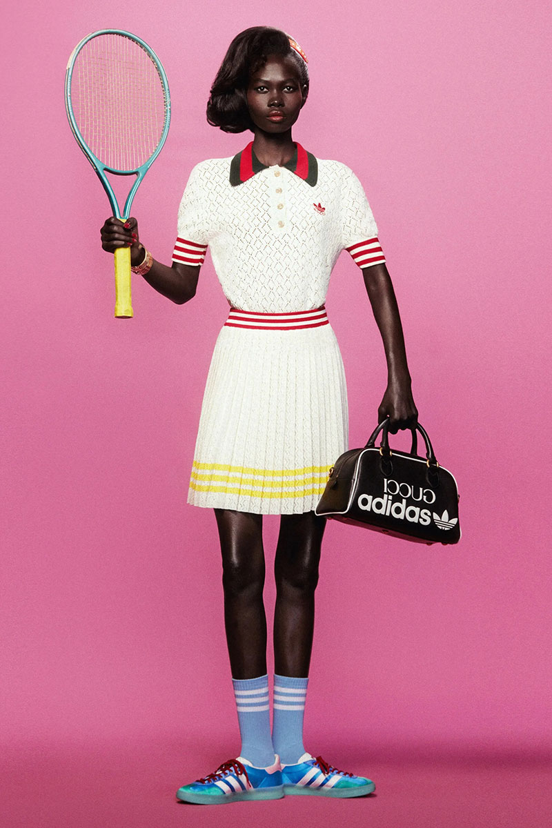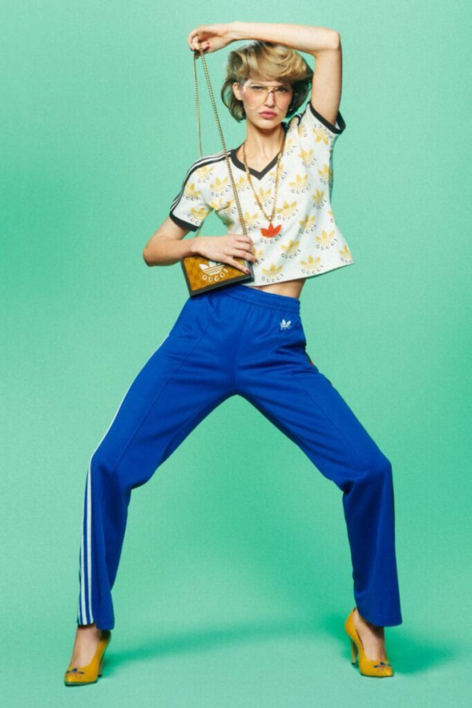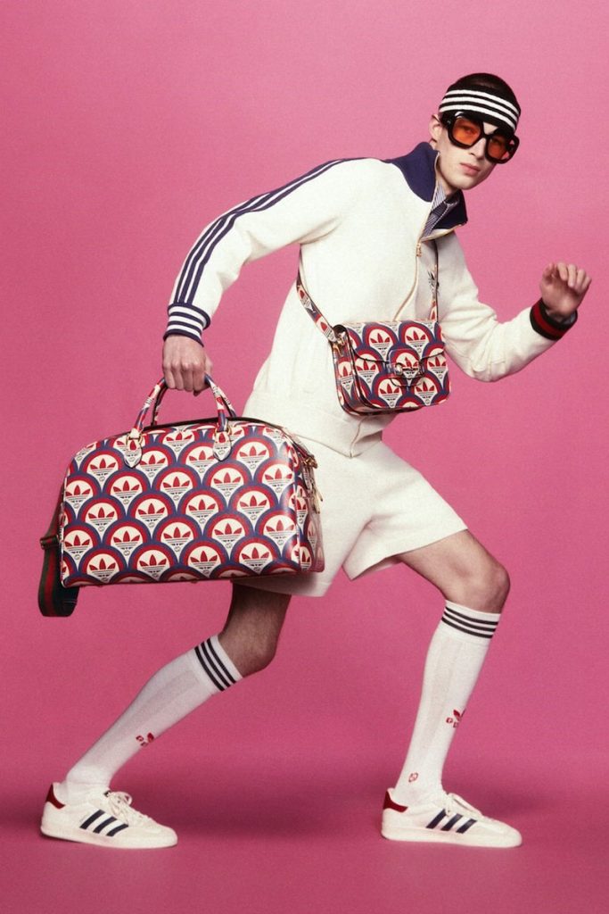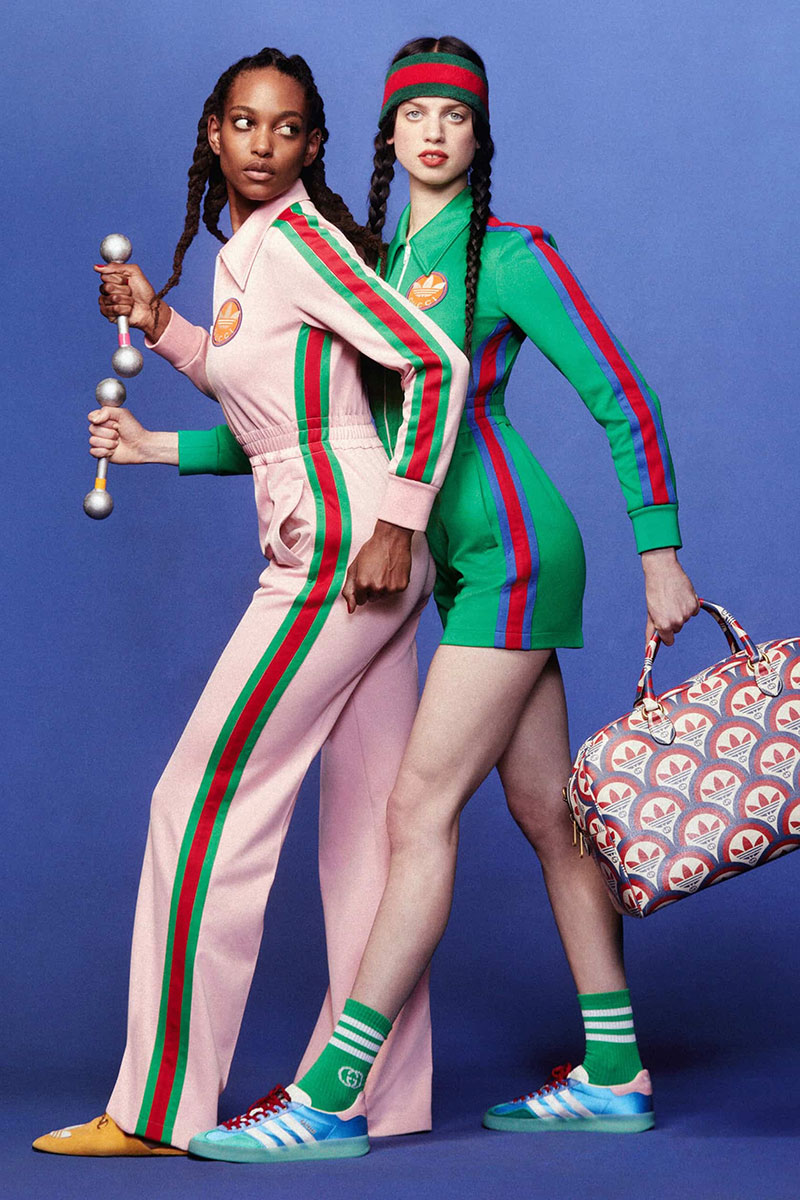 Adidas x Gucci koleksiyonunda hem kadın hem de erkekler için hazır giyim parçaları ve bunun yanı sıra çantalar, ayakkabılar, aksesuarlar ile mücevherler yer alıyor. Koleksiyonda Gucci’nin GG monogramını ve birbirinin içine geçen G’leri Adidas’ın Trefoil logosuyla bir arada, rengrenk baskılarda ve jakarlı kumaşların desenlerinde görebiliyoruz. Gucci’nin ünlü Web of Gucci deseni de Adidas’ın ikonik üç çizgisine eşlik ediyor.