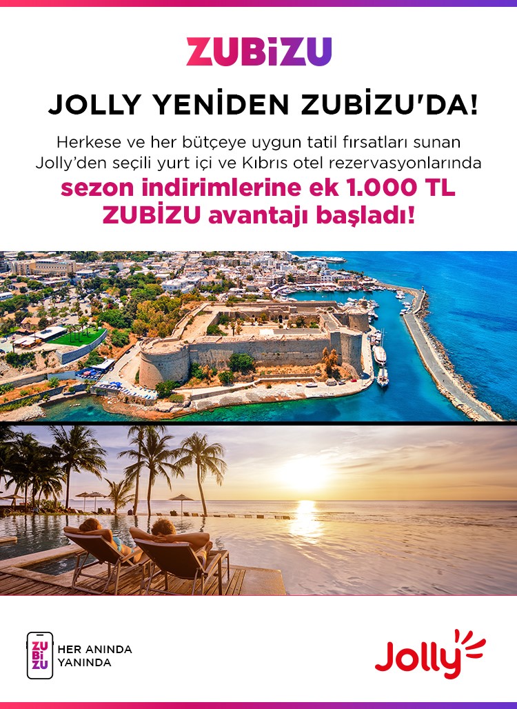 Jolly Tur'dan seçili yurt içi ve Kıbrıs otel rezervasyonlarında sezon indirimlerine ek 1.000 TL ZUBİZU fırsatı seni bekliyor!