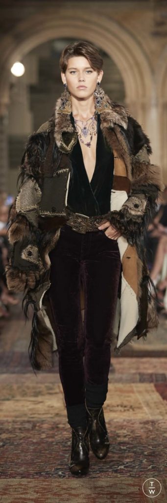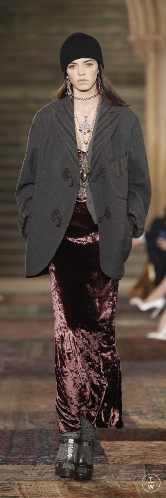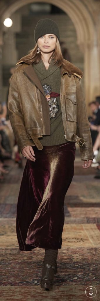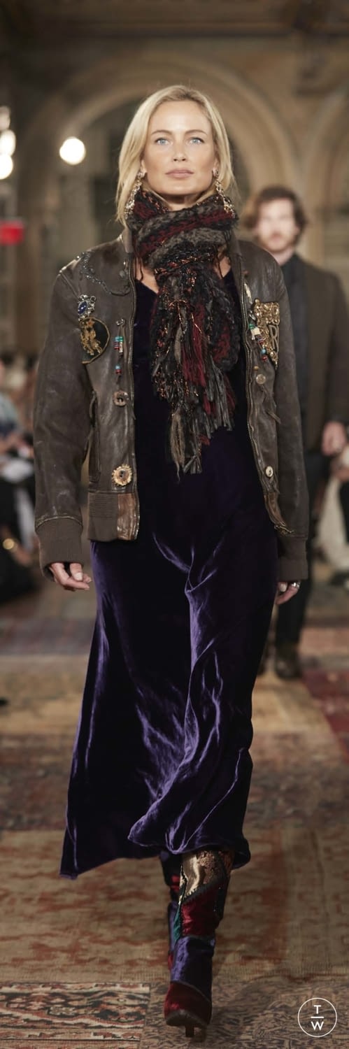 Kadifeler, Ralph Lauren Collection’dan parçalara romantik ve bohem bir hava katan kumaşlar oldu. Zümrütten mürdüme uzanan renkleri ve eşsiz dokularıyla defilenin öne çıkan elbisleri ve eteklerinde göz alıcı ışıltılar yarattılar. Bir diğer doku ise, özellikle Amerikan tarihinin çeşitli dönemlerinden ikonik silüetleri podyuma taşıyan Double RL tasarımlarında yer verilen deri oldu. Hem kadın hem de erkeklere yönelik parçalarda rastladığımız deri ceketler kürklü yakalar veya çeşitli yamalarla süslendi.