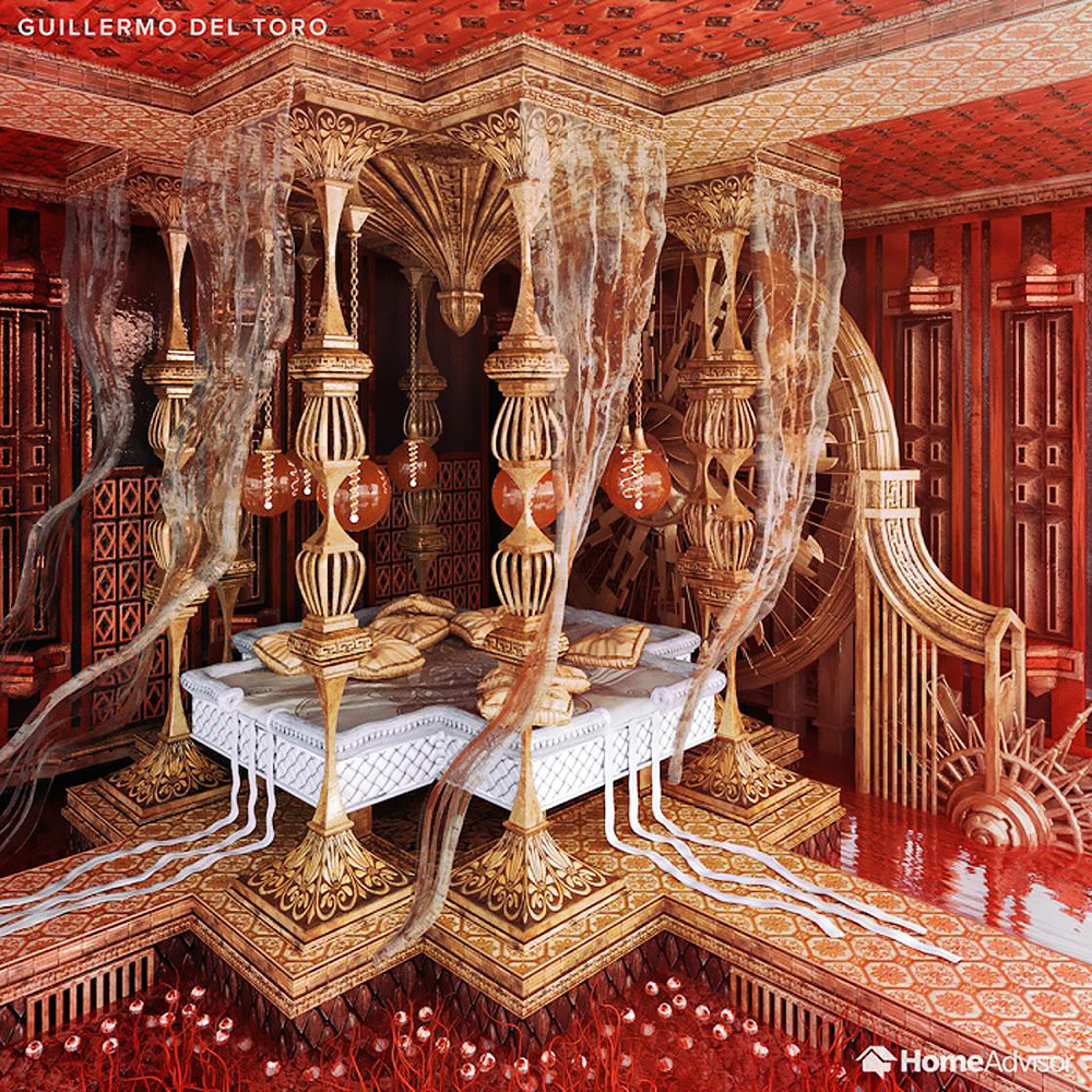 Del Toro’nun filmlerinde genellikle tuhaf yaratıklar ve ürkütücü ortamlarla tanışırız. Bu stili Viktorya dönemi mimarisinden daha iyi yansıtan bir iç dekorasyon tarzı düşünemiyoruz. Kırmızı ve altın tonlarının ağır bastığı bu hayal ürünü yatak odası tasarımına da aynı ürkütücü ama cazibeli tuhaflık hakim. Eğer Del Toro’nun stiline gerçek dünyada yaklaşmak isterseniz odanızı eski saatler veya ilginç mekanik objelerle süsleyebilirsiniz.