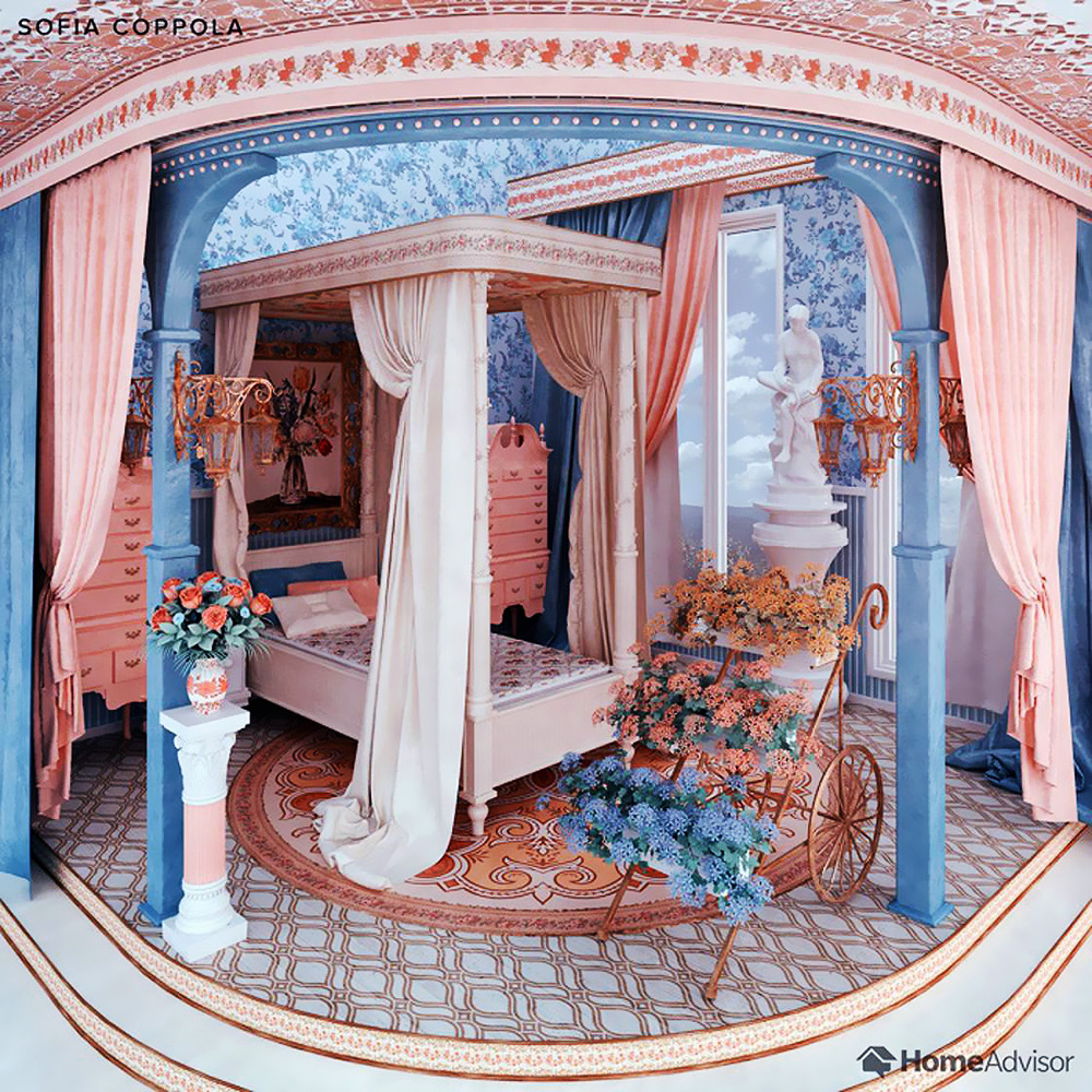 Coppola’nın Marie Antoinette filmi, Versailles’ın görkemini kendi görsel stiliyle yansıttığı unutulmaz bir görsel şölendi. Bu yatak odası tasarımında da filmin etkisi büyük. Pastel renkler duvar kağıdından mobilyalara kadar her yerde kullanılmış, içeri giren doğal gün ışığı ise odanın rüya gibi atmosferini pekiştirmiş.