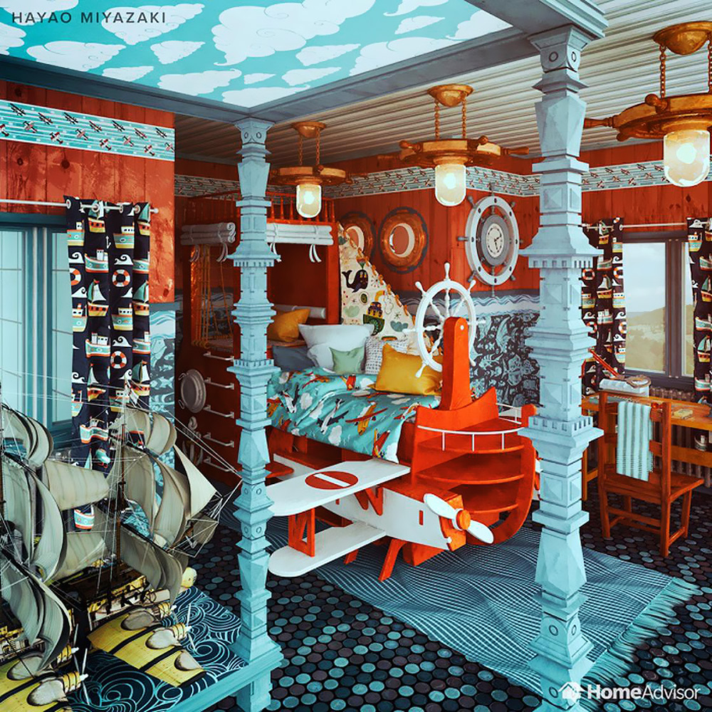 Studio Ghibli’nin kurucusu Miyazaki’nin animasyonları bizi hayallerin ötesinde dünyalara götürüyor, Miyazaki’nin yatak odası da öyle… Bu odanın çocuksu renkleri, gökyüzünü içeri taşıyan tavan boyaması ve desenlerle yaratılan deniz efekti rüyalara dalmak için mükemmel bir mekan oluşturmuş.