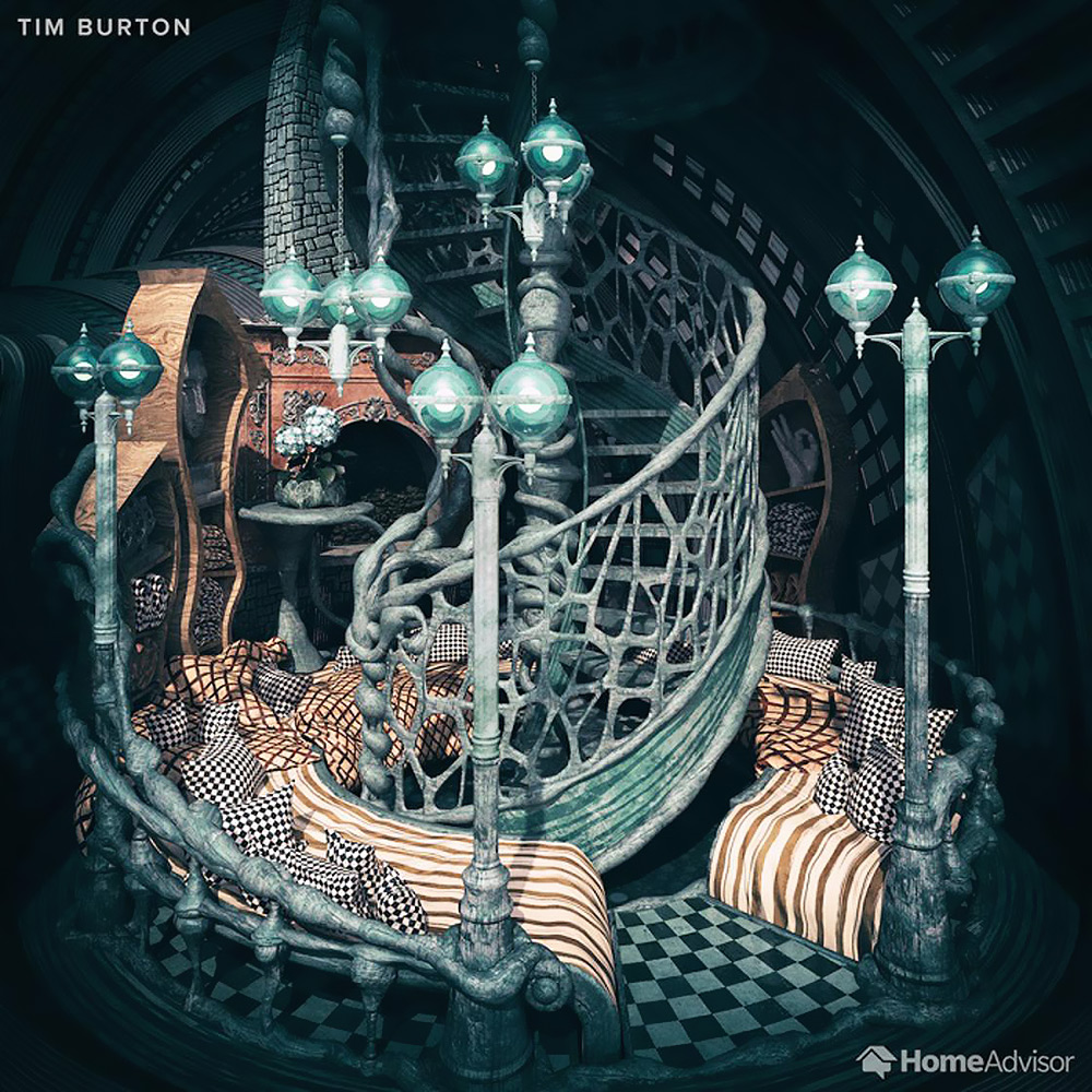 Gotik masal anlatıcısı Tim Burton’un odasındaki ana renk elbette siyah. Kıvrımlı tuhaf detaylar, dama desenleri ve garip bir kabusun ürünü gibi duran lambalar bu odaya Burton stilini katan en önemli unsurlar. Oda ne kadar korkutucu dursa da garip bir çekiciliği olduğu kesin, tıpkı yönetmenin filmleri gibi…