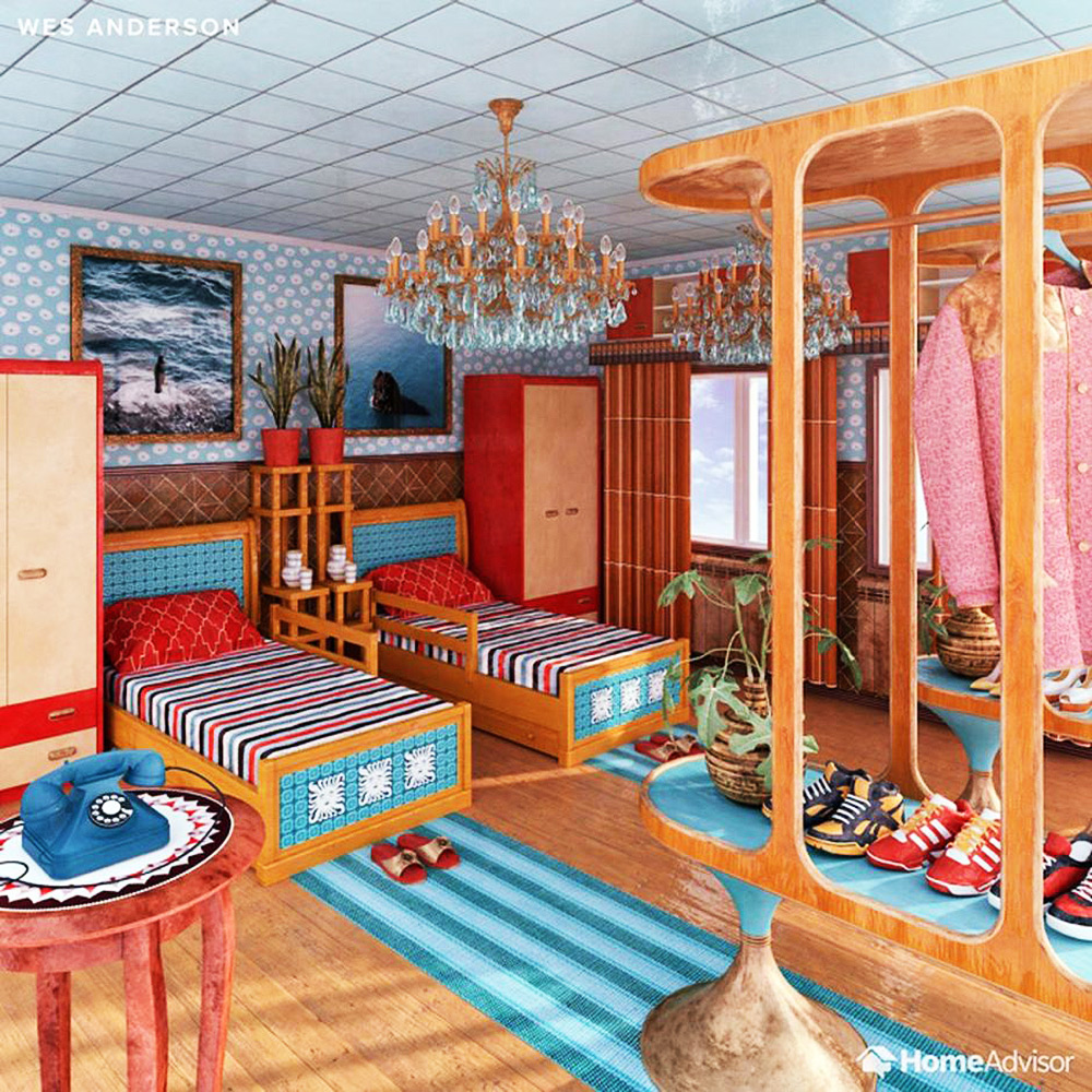Wes Anderson’un özgün görsel stilini taşıyan bu oda belki tüm tasarımlar arasında gerçek dünyaya en çok yaklaşan dekorasyona sahip. Grand Budapest Hotel ve Royal Tenenbaum havasını yakalamanın en temel kuralı simetriye sadık kalmak. Daha sonra sıra, odayı pastel ve canlı renklerin dengeli bir karışımıyla dekore etmeye ve detaylarda eski moda mobilyalar ve objeler kullanmaya geliyor. Eski tip çevirmeli bir telefon iyi bir başlangıç noktası olabilir.