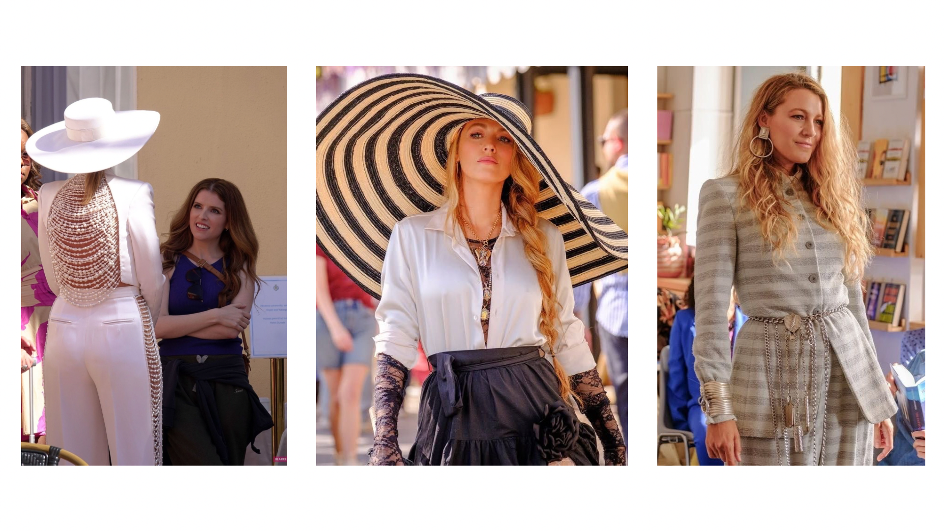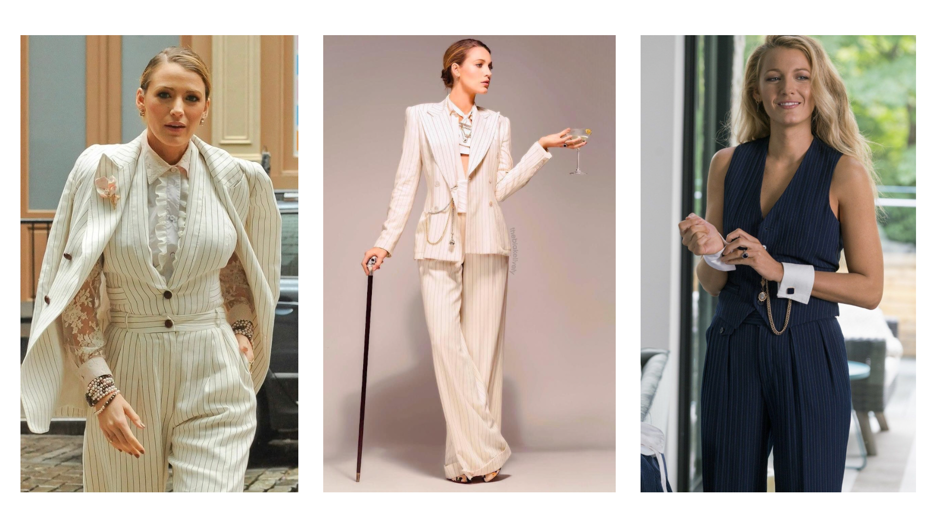 Emily Nelson’ın stilinde, 1920’lerin erkek modasından ilham alınmış lüks kumaşlar ve keskin terzilik bir araya getirilmiş. Lively’nin duruşu da bu kıyafetleri sadece taşımıyor bir karakter dili olarak yorumluyor.
